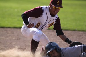 Tyler Chin catches the ball and almost tags Exavier Villanueea out during the frosh/soph baseball game of Abraham lincoln high school vs O’Conell High school. The Lincoln Mustangs won 10-5, Tuesday april 29th, photographed by Katie Sanders.